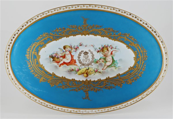 Manifattura di Sèvres, secolo XIX. Vassoio ovale in porcellana decorata in policromia con putti e fiori entro riserva, centrato da monogramma coronato in oro, bordure a fiori e volute in oro su fondo azzurro (cm 56,5x38) (lievi difetti)