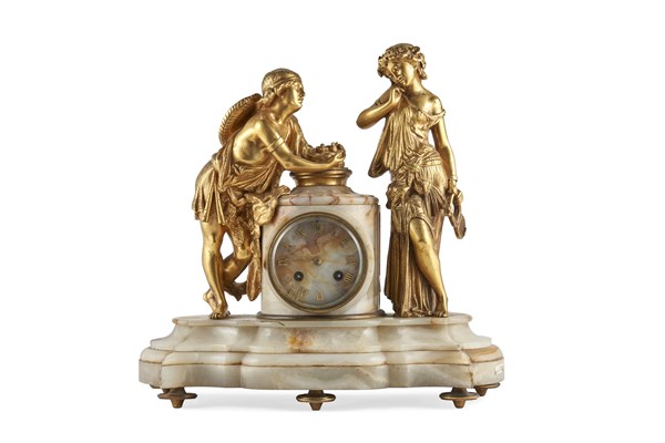 Orologio in alabastro e bronzo dorato con cassa sormontata da scena galante. Qu