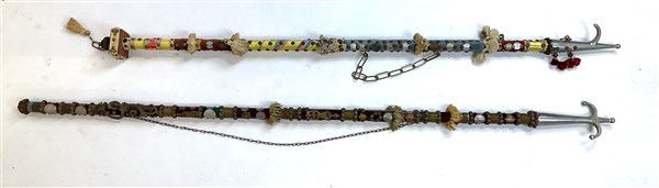 Due mezzo marinaio in metallo decorato da applicazioni a monete e borchiature (h max cm 150) (difetti)