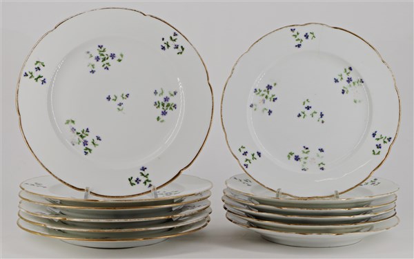 Manifattura Nast, Parigi, inizio secolo XIX. Lotto composto da sei piatti e sei piattini decorati in policromia a mazzetti di fiordaliso sparsi e profilo in oro (d max 25) (difetti)