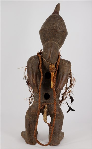 Arte africana, scultura in legno decorata con corde, piume e conchiglie