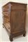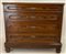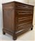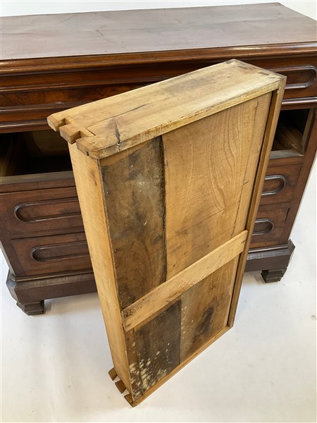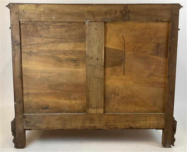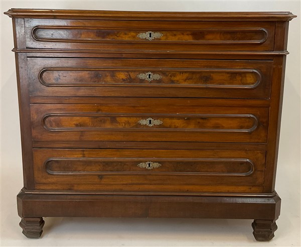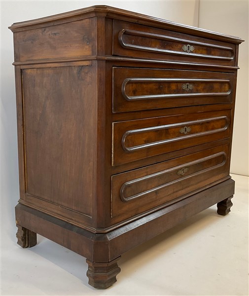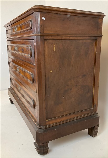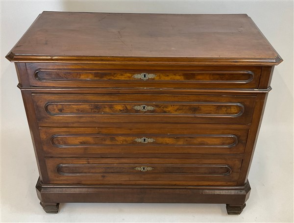 Cassettone in noce con fronte a quattro cassetti con pannellature radicate. Ini