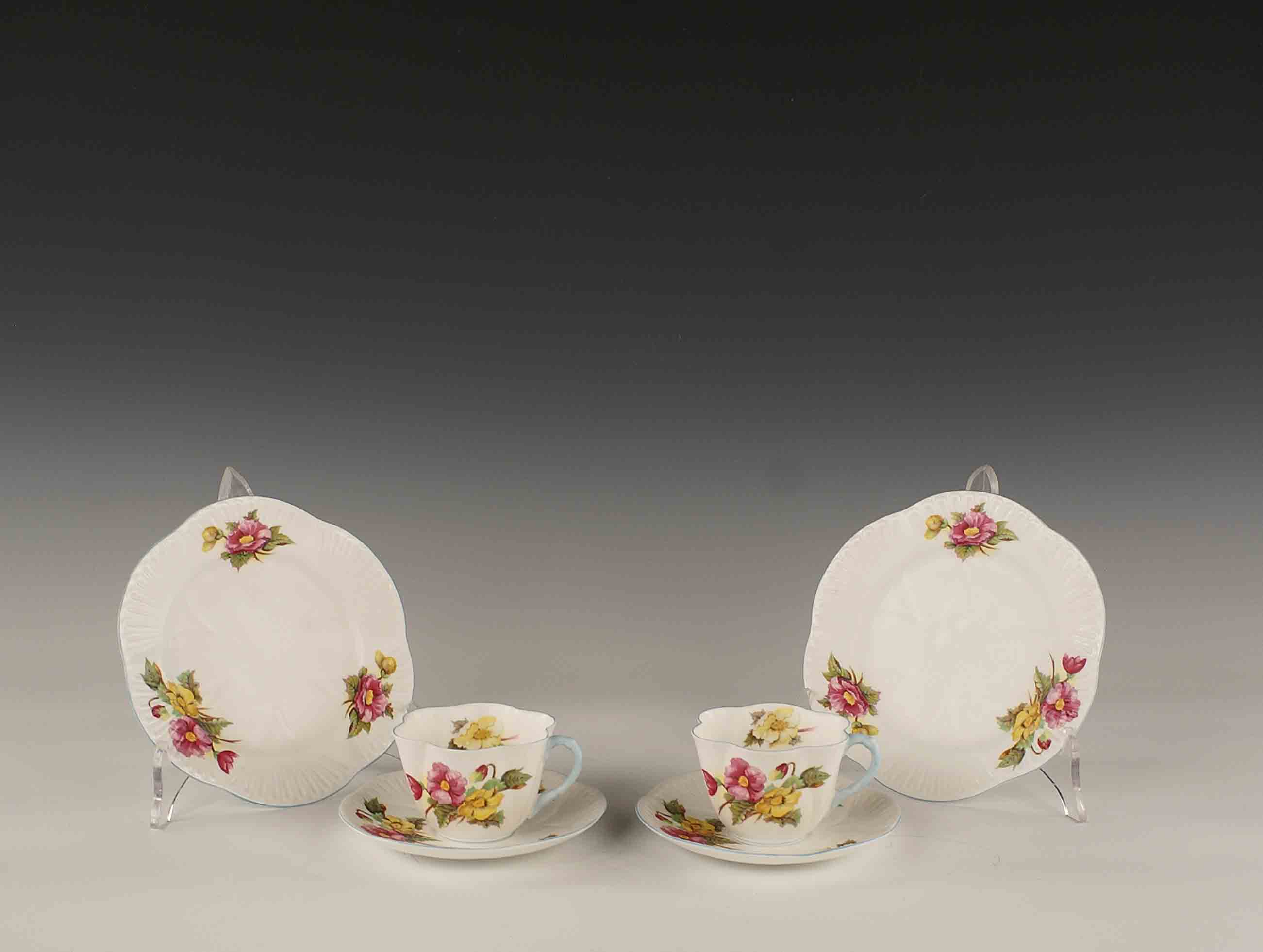 Servizio tete a tete in porcellana Shelly, Inghilterra, composto da due tazze con relativi piattini e due piatti dessert.
