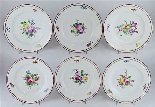 Manifattura di Napoli, inizio secolo XIX. Gruppo di sei piatti in porcellana decorati in policromia a fiori e profilo in oro (d cm 24) (lievi difetti)