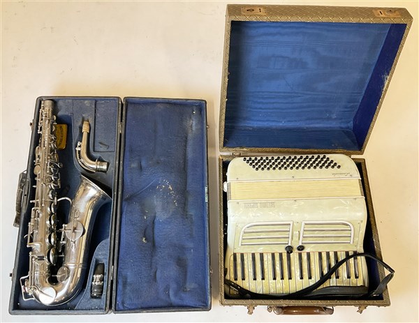 Lotto composto da un sassofono tenore della ditta Maino & Orsi, Milano 1900 c., e una fisarmonica Lucciola Settimio Soprani, entro custodie (difetti)
