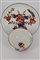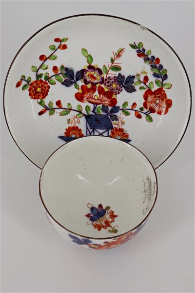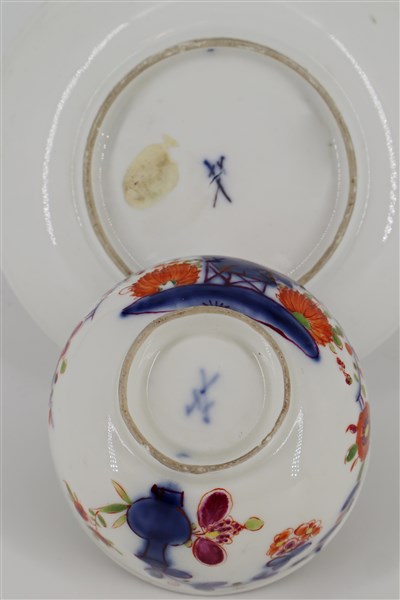 Manifattura di Meissen, secolo XVIII. Tazzina con piattino in porcellana dipinta in policromia con decoro "al tavolino" (tazzina h. cm 4,5; piattino d. cm 13) (difetti)