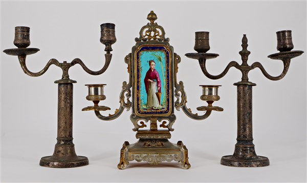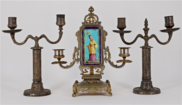 Manifatture differenti, secolo XIX. Lotto composto da un candelabro a due fiamme in metallo in parte dorato e centrato da placca in porcellana raffigurante figure orientali in policromia su ambo i lati unito a una coppia di candelabri a due fiamme in metallo argentato (h. max cm 28) (difetti e mancanze)