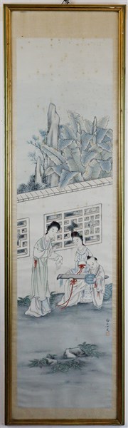 Dipinto su carta raffigurante un figura feminile ed un bambino in giadino recante firme