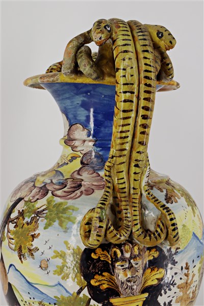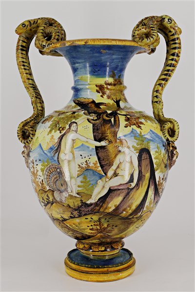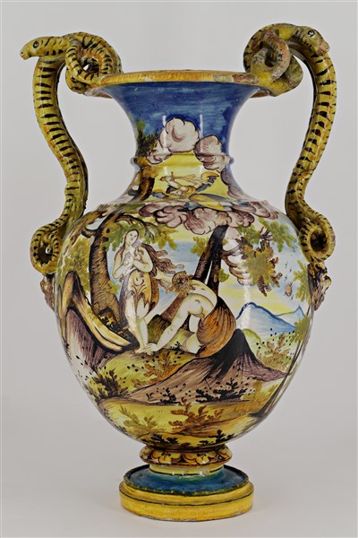 Manifattura del secolo XIX. Vaso in ceramica biansato a serpi intrecciate decorato in policromia con le storie di Adamo ed Eva (h cm 56,5) (difetti e restauri)