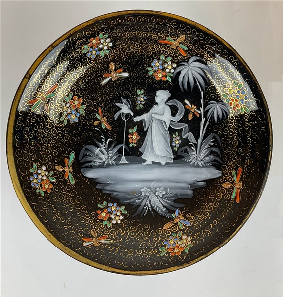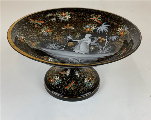 Manifattura del secolo XIX. Alzata in vetro nero decorato a smalti policromi con figura, fiori, insetti e profili in oro (h cm 10; d cm 18) (lievi difetti)
