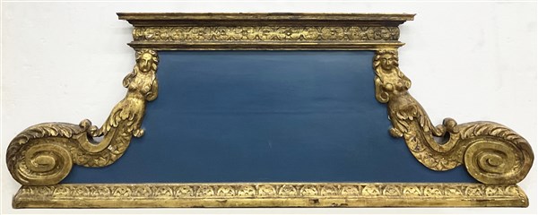 Antica testata da letto in legno intagliato e dorato con montanti a erma con voluta a ricciolo (cm 182x69) (difetti)
