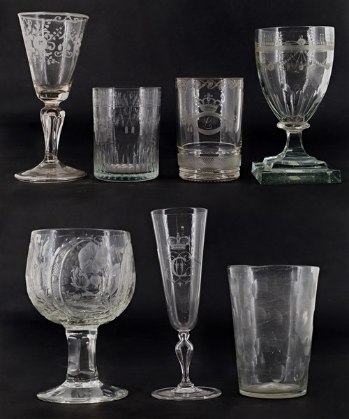 Manifatture differenti, secoli XIX-XX. Lotto composto da diversi bicchieri e calici in vetro con decorazioni incise (h max cm 18,5) (difetti)