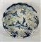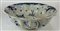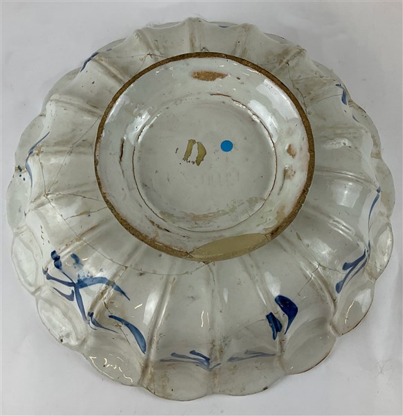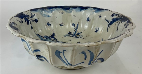 Manifattura ligure, secolo XVIII. Grande bacile costolato in maiolica a profilo polilobato decorato il blu a figure e paesetti (d cm 41; h cm 16) (restauri)
