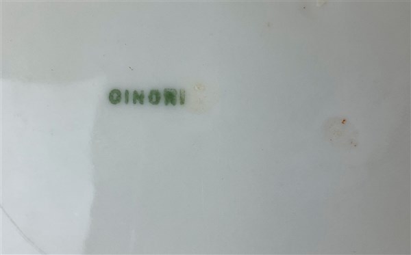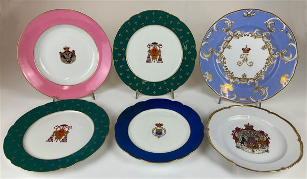 Manifatture differenti, secolo XIX-XX. Sei diversi piatti in porcellana decorati in policromia con profili in oro, centrati da stemma araldico. Dei quali tre marcati Ginori e uno Berlino (d max cm 25) (lievi difetti)
