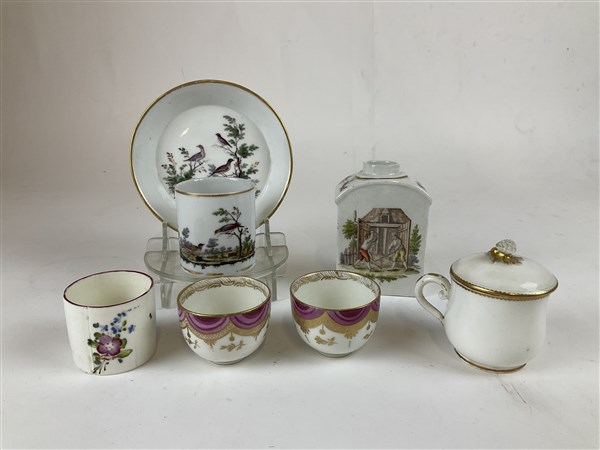 Manifatture diverse, secolo XVIII-XIX. Lotto composto da diversi oggetti in porcellana tra cui una tazza con piatto decorato a motivo ornitologico (Ginori), due chicchere a festoni rosa e oro (Vienna), una cremiera con coperchio profilata in oro (Sèvres), un bicchierino decorato a fiori (Mennecy) e un porta tè di differente manifattura mancante di coperchio (difetti)