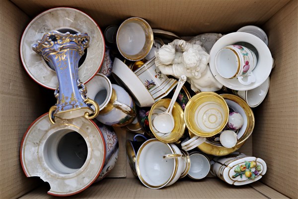 Manifatture diverse, secolo XIX-XX. Lotto composto da vari oggetti in ceramica e porcellana di differente forma, uso e manifattura. In un cartone (difetti e rotture)