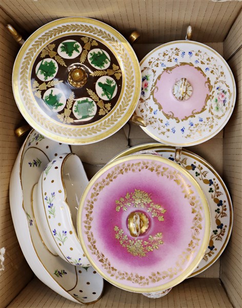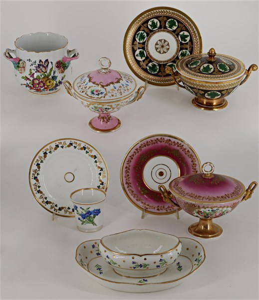 Manifatture differenti, secolo XIX-XX. Lotto composto da diverse coppe con coperchio e piatto, una salsiera, un cestino e un vaso biansato (difetti)