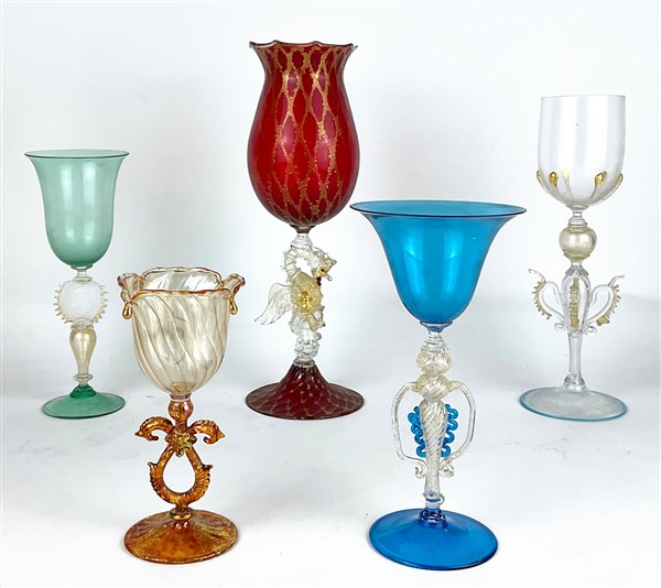 Manifattura di Murano. Lotto composto da cinque diversi calici in vetro soffiat