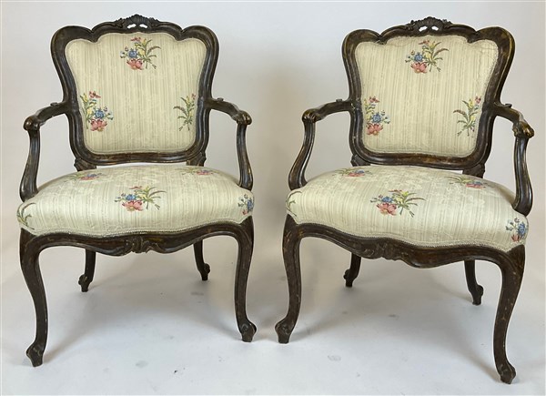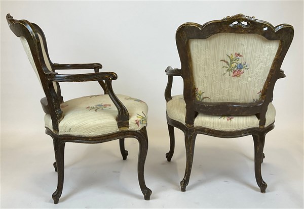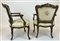 Coppia di antiche poltrone in legno intagliato e laccato con schienale sagomato