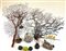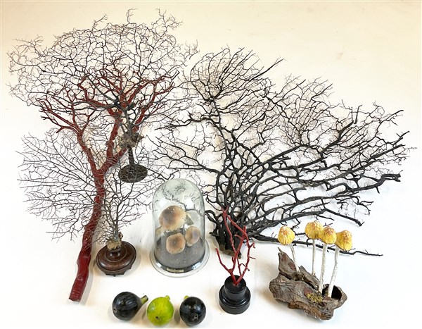 Lotto composto da diversi rami a finto corallo, due composizioni in legno a forma di funghi e tre a forma di fico. In un cartone (h max cm 120) (difetti)
