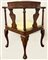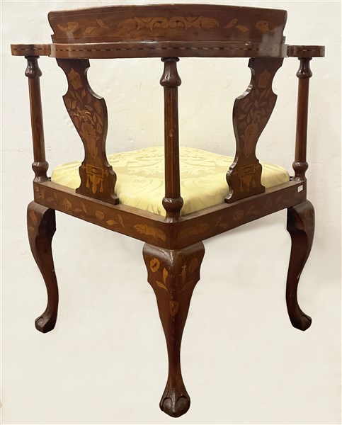 Poltrona in mogano intarsiata a motivo floreale in legni vari, schienale arrotondato e gambe mosse. Olanda, inizio secolo XX (difetti)