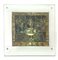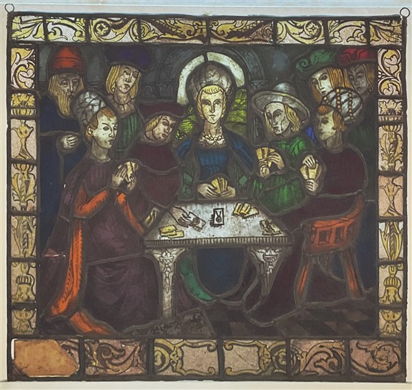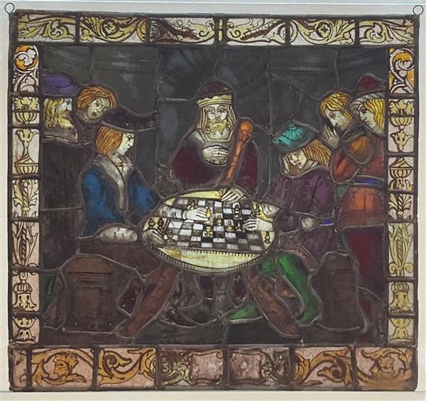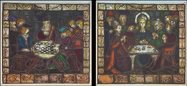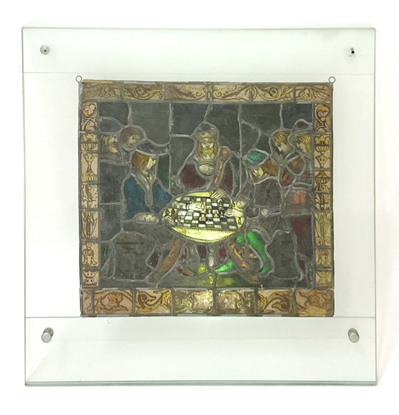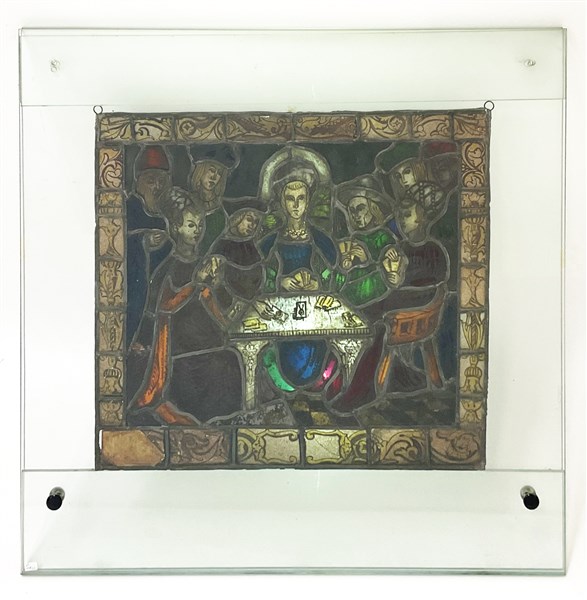 Coppia di antichi pannelli in vetro dipinto e piombato raffiguranti sovrani intenti al gioco con cortigiani (cm 47x51) montatura in vetro con struttura metallica d'epoca successiva (difetti e restauri)