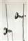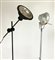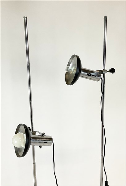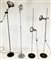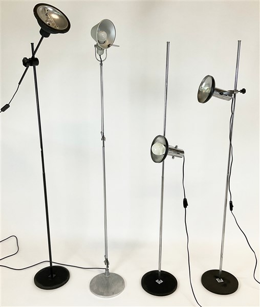 Quattro lampade a stelo con base circolare nera, tra cui una modello Tolomeo di