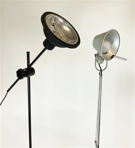 Quattro lampade a stelo con base circolare nera, tra cui una modello Tolomeo di Michele Delucchi per Artemide. Epoche e manifatture diverse. (lievi difetti)