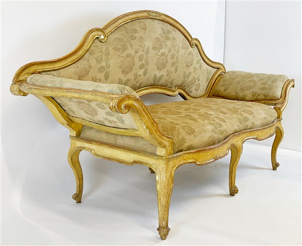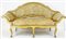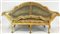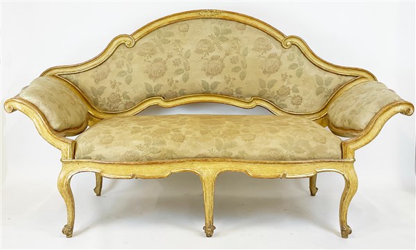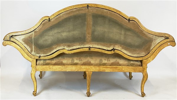 Divano a ventaglio in legno intagliato, laccato e dorato. Schienale a volute contrapposte, braccioli terminanti a ricciolo, gambe mosse. Secolo XVIII (L. cm 210) (difetti)
