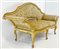 Divano a ventaglio in legno intagliato, laccato e dorato. Schienale a volute co