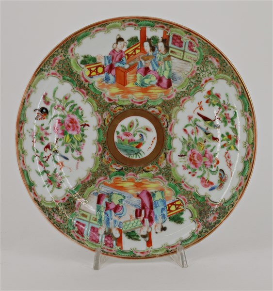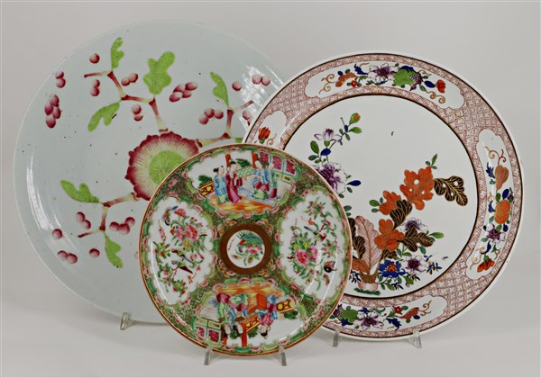 Lotto composto da tre piatti in porcellana policroma con decori vari Cina e Gia