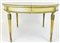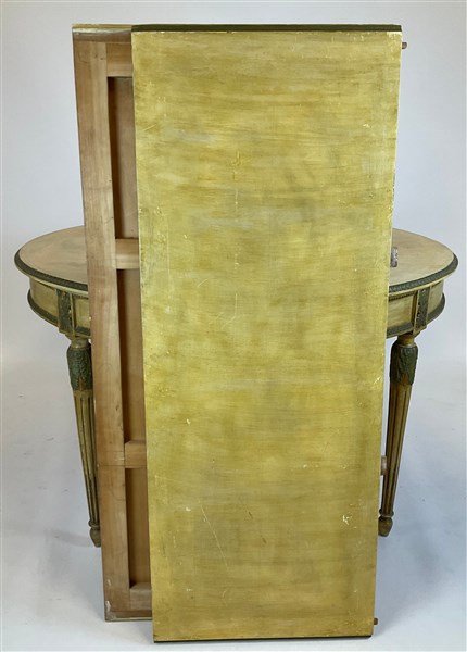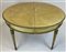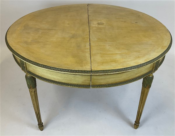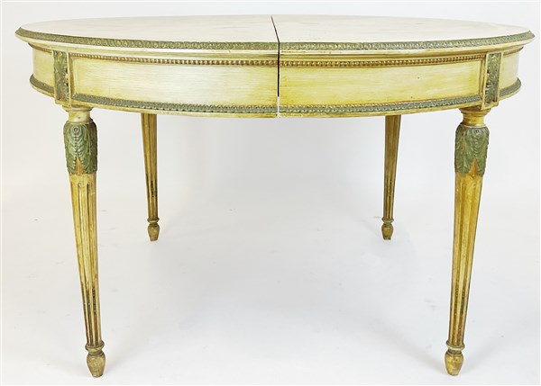 Tavolo allungabile in legno intagliato, dipinto e dorato con piano circolare bordato da motivi a foglie, gambe rastremate e scanalate (h cm 78; d cm 130) (difetti) dotato di due allunghi