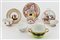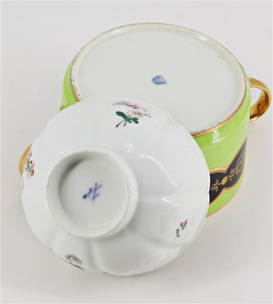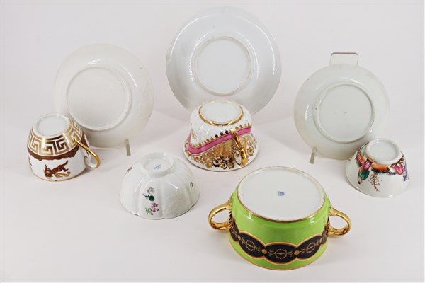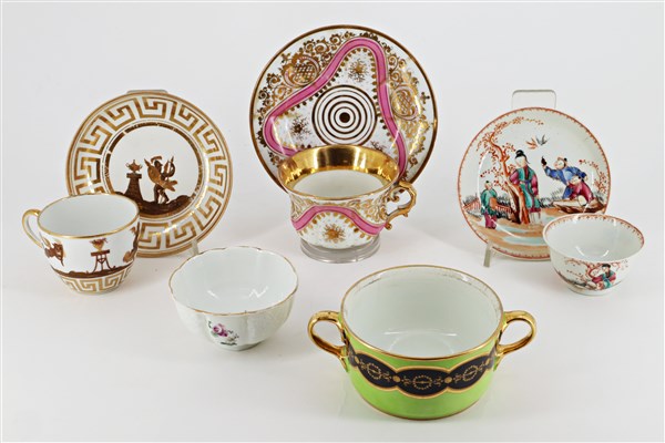 Manifatture differenti, secolo XVIII-XIX. Lotto composto da una chicchera polilobata decorata a fiori (Meissen), tre tazze con piattini con decori diversi e una tazza da brodo biansata (Vienna) mancate del coperchio (difetti e restauri)