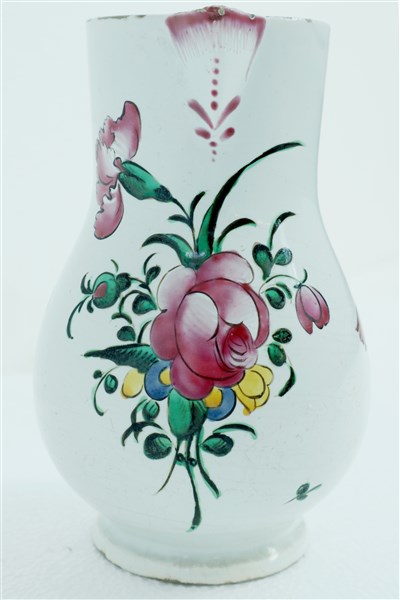 Manifattura di Nove, Bassano, secolo XVIII. Lotto composto da tre chicchere ed un piattino in porcellana con diverso decoro policromo a motivo floreale, uniti ad un versatoio in maiolica di altra manifattura (h. max cm 15) (difetti e sbeccature)