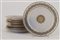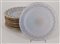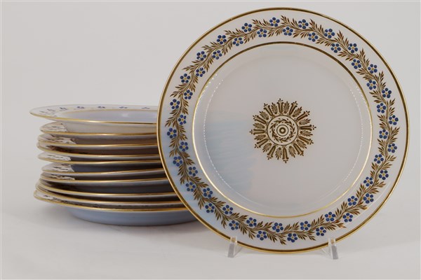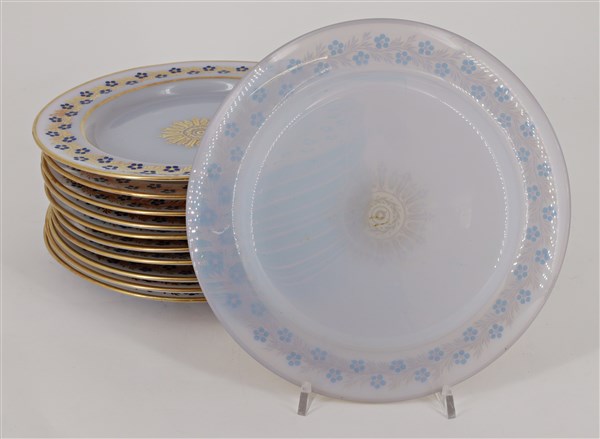 Manifattura del secolo XIX. Gruppo di undici piatti in vetro opalino decorati a corolle e rosoni in oro con fiori blu, profili in oro (d cm 22) (difetti)
