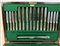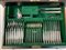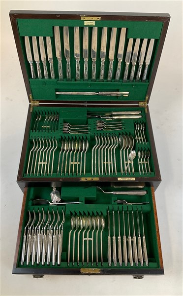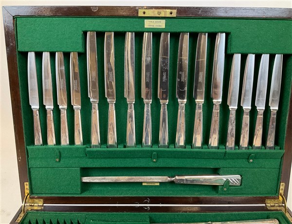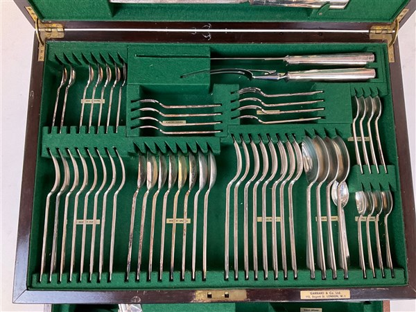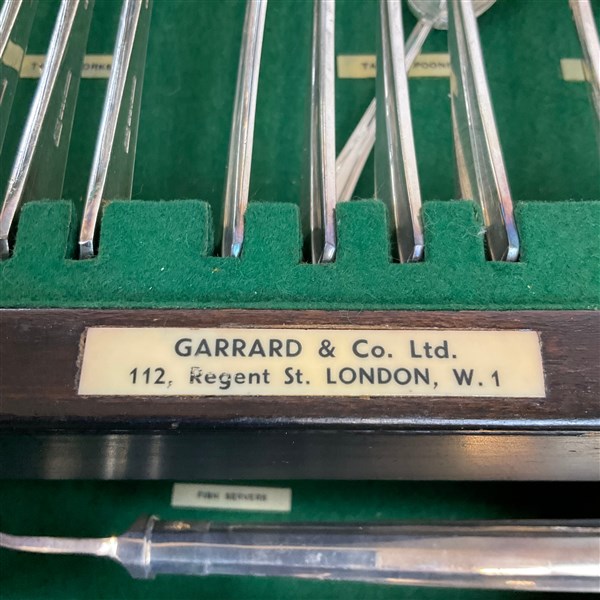 Manifattura Garrard & Co Ltd, Londra. Servizio di posate in metallo argentato completo per otto persone. Entro cofanetto originale (difetti, un cucchiaino da caffè mancante)
