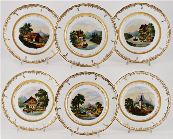 Manifattura KPM, Berlino, secolo XIX. Gruppo di sei piatti in porcellana decorata nel cavetto in policromia a paesaggio, profili in oro (d cm 21,5) (lievi difetti)