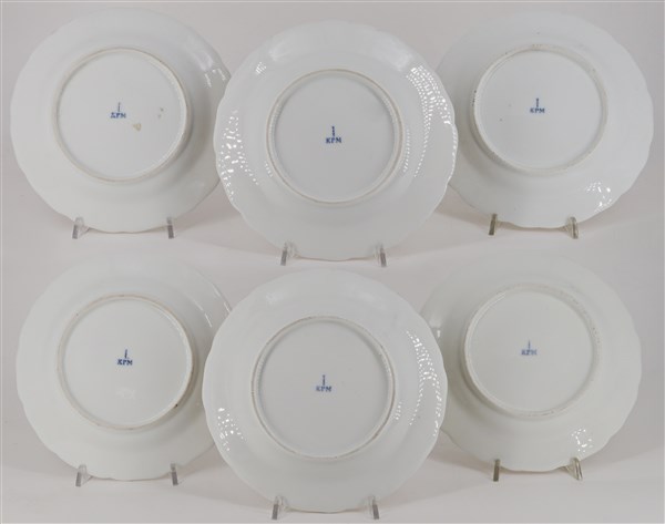 Manifattura KPM, Berlino, secolo XIX. Gruppo di sei piatti in porcellana decora