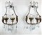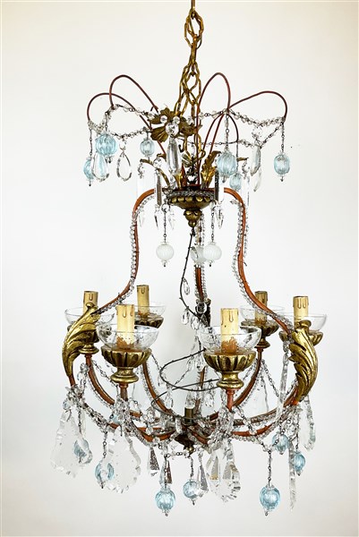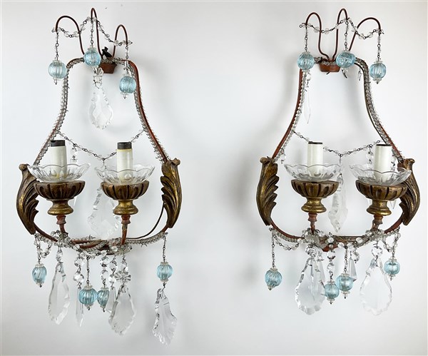 Lotto composto da un lampadario a cesto a sei luci con struttura in metallo e legno intagliato e dorato decorata a pendenti unito a coppia di applique a due fiamme con struttura in legno intagliato e dorato a volute fogliate, decorate con pendenti in vetro e cristallo incolore e azzurro (difetti)