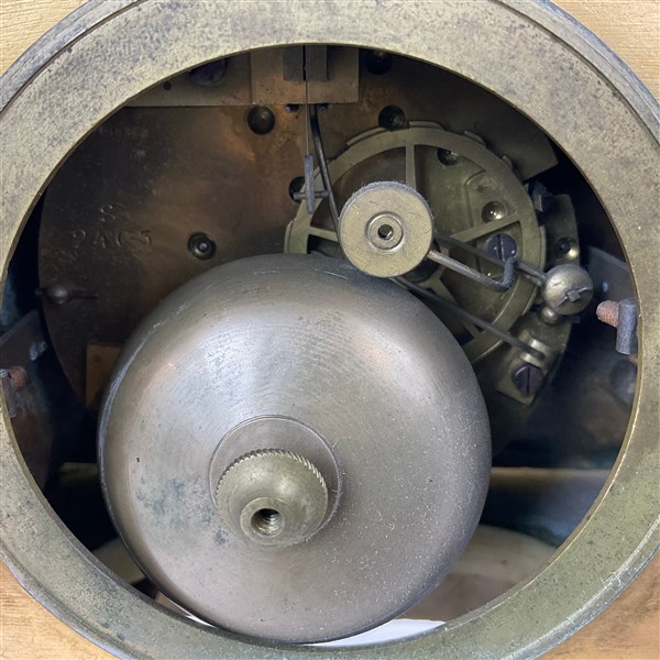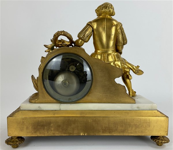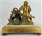 Pendola in bronzo dorato e marmo sormontata da figura di gentiluomo a tutto tondo. Quadrante in smalto bianco a numeri romani, suoneria delle ore e mezze su campanello. Francia, ultimo quarto del secolo XIX (cm 30,5x29x12) (difetti)