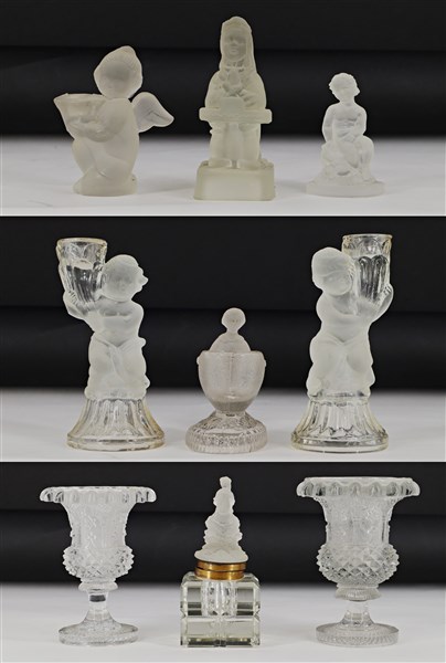 Manifatture diverse, secoli XIX-XX. Lotto composto da diversi oggetti in vetro molato e vetro pressato di differente forma e decoro ( h max cm 22,5) (difetti)