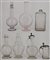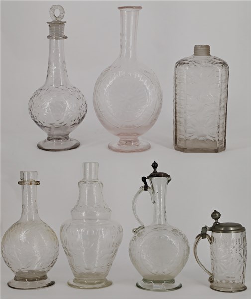 Manifatture diverse, secolo XVIII-XIX. Gruppo di diverse bottiglie e un boccale in vetro molato con decori differenti, due con coperchi in metallo (difetti)