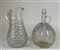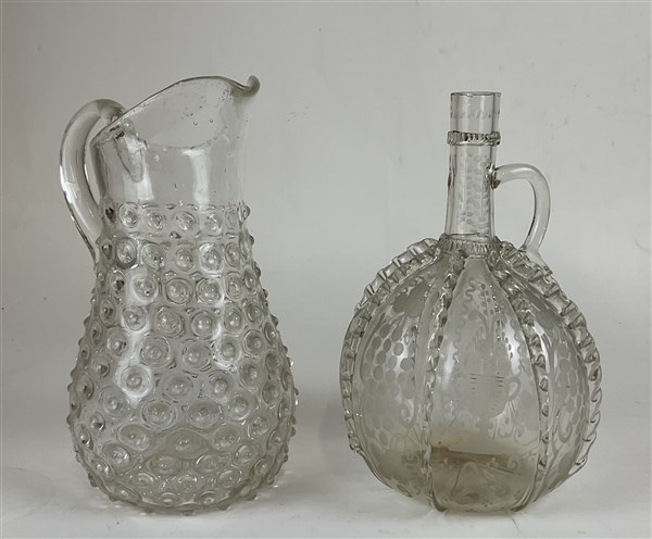 Manifattura del secolo XVIII-XIX. Lotto composto da una bottiglia ad un'ansa con corpo percorso da morise applicate a caldo alternate a decori incisi e una brocca ad un'ansa in vetro bugnato (h max cm 25,5) (lievi difetti)
