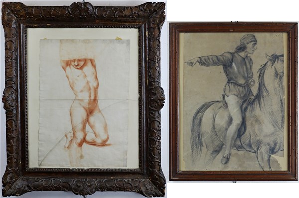 Lotto composto da un disegno a sanguigna raffigurante "nudo maschile" ed un disegno a carboncino raffigurante "figura a cavallo" di artisti e misure differenti