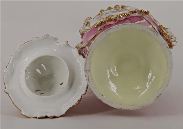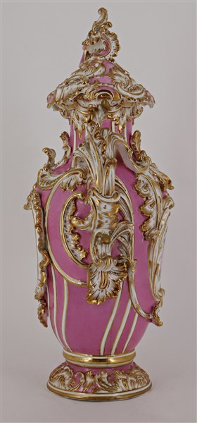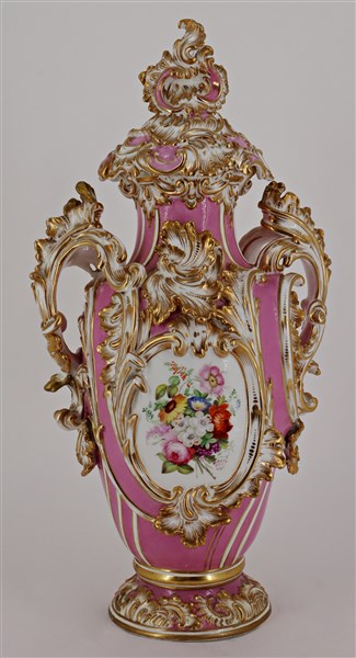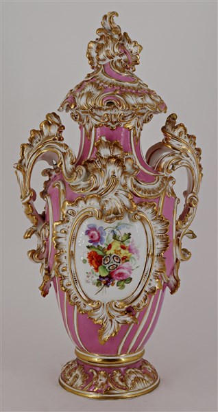 Manifattura del secolo XIX. Vaso biansato con coperchio in porcellana decorato in policromia a fiori entro riserva su fondo rosa, bordure rocailles a rilievo (h. cm 46) (lievi difetti e restauri)