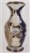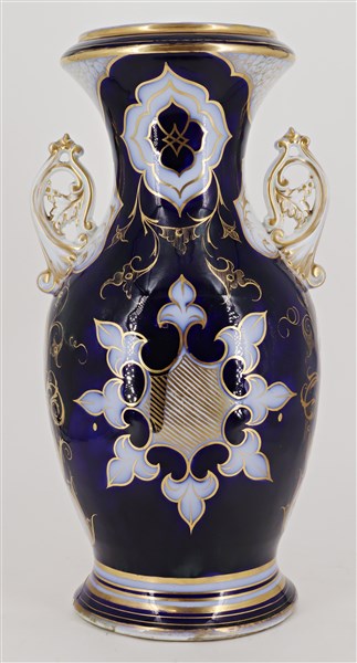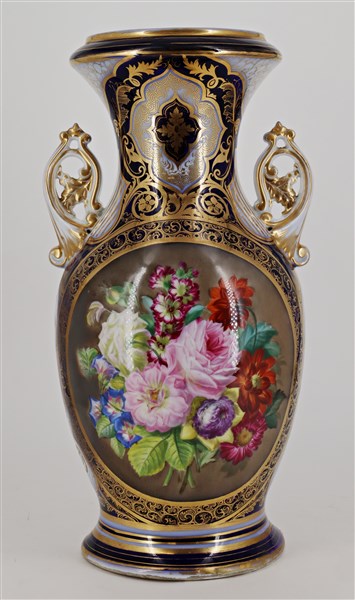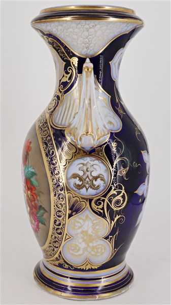 Manifattura del secolo XIX. Vaso biansato in porcellana decorato in policromia a mazzo fiorito entro riserva ovale su fondo blu e profili in oro (h. cm 47) marca e numerali incussi alla base (difetti)