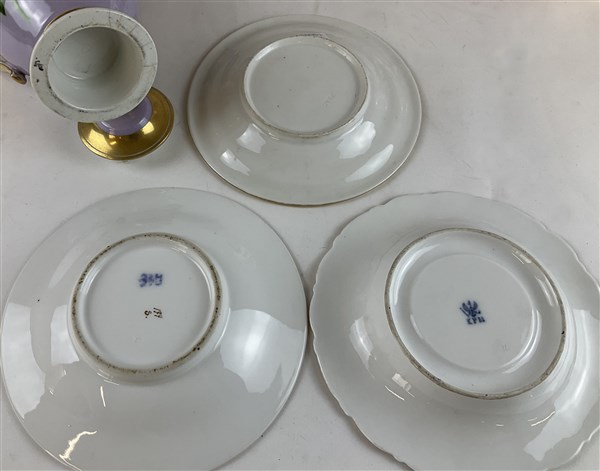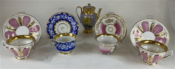 Manifatture diverse, secolo XIX. Lotto composto da quattro tazze con piattini in porcellana, delle quali una con decori su fondo blu (KPM, Berlino), ed una teiera con coperchio in porcellana decorata in policromia a fiori su fondo lilla e bordure in oro (Vienna) (difetti)