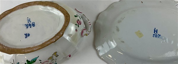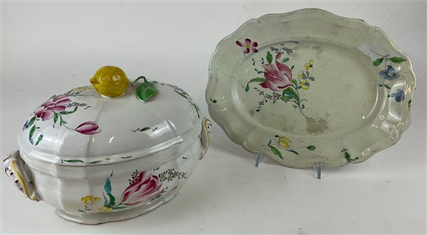 Manifattura Hannong, Strasburgo, secolo XVIII. Zuppiera con coperchio in maiolica decorata a fiori con presa a foggia di limone a tutto tondo unita ad un piatto di analogo decoro, firma della manifattura H con numerali alle basi (difetti e restauri)