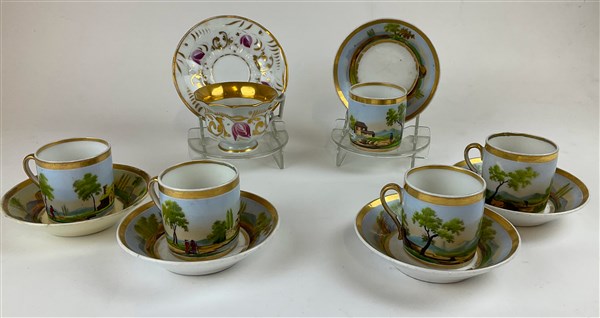 Manifattura del secolo XIX. Lotto composto da cinque tazze con piattino in porcellana decorata a paesaggi continui con profili in oro e una tazza con piatto con decoro floreale in porpora e oro (difetti e restauri)