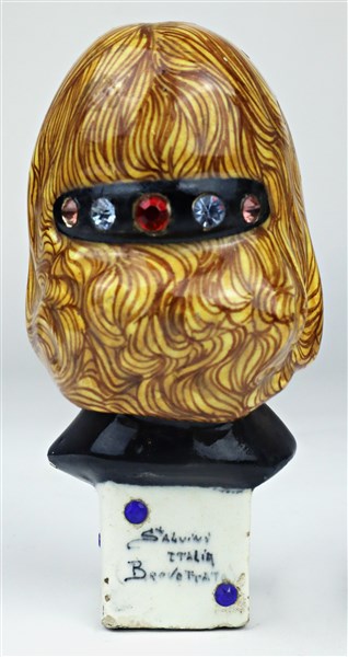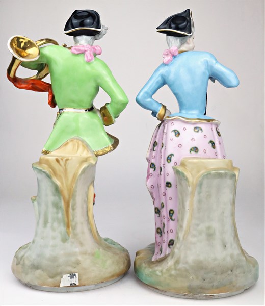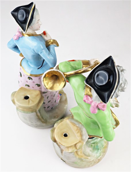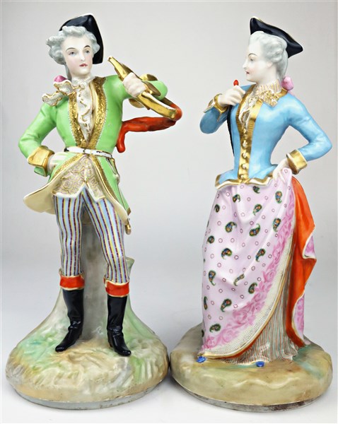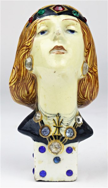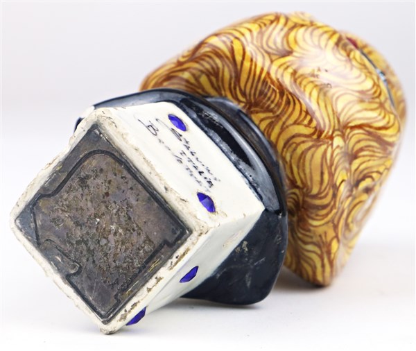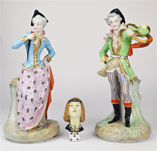 Manifatture diverse. Lotto composto da due basi per lampada in porcellana raffiguranti gentiluomo e gentildonna con profili in oro, uniti ad un sigillo di gusto Liberty a busto femminile e applicazioni, reca iscrizione al retro "Salvini Italia Brevettato" (difetti)